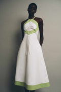 Experience timeless elegance with the 50s Dress, crafted from heavy cotton poplin for a structured fit and graceful twirl. Its feminine full skirt is accented with honeydew cotton grosgrain trim and flattering racer straps. Designed to hug the bust and waist, it features an attached bow and a discreet back zipper for a polished finish. Perfect for those seeking a modern yet classic silhouette.