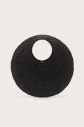 An oversized black woven circular  handbag on a light beige background