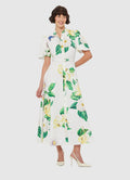 Delicately hand-painted daisies and camellias adorn a crisp white canvas, while cobalt blue butterflies add a playful touch. The Bianca Short Sleeve Midi Dress features a fitted banded waist and a voluminous A-line skirt, crafted from premium cotton for comfort and elegance. Perfect for sunny days, this dress combines timeless charm with effortless sophistication.