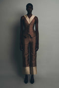 The Flying V Vest offers a fresh take on classic tailoring with a sculptural twist. Made from a lustrous brown and cream polka-dot fabric, this sleeveless vest features a bold V-shaped neckline and a pointed hem for a sleek silhouette. The fitted bodice is detailed with fabric-covered buttons and a back buckle that subtly defines the waist, combining elegance with modern design.