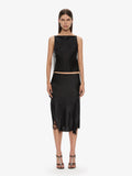This Lattice Silk Top features a liquid satin front sculpted for an elegant silhouette, framed delicately with sheer lace. Draped lace cascading from the shoulders creates graceful movement, combining fluidity with refined structure for a timeless, sophisticated look.