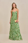 The Renay Dress captivates with its luxurious silk burnout fabric and a fitted bodice accented by gold-toned hardware at the center bust. This elegant detail harmonizes beautifully with the gown’s flowing full-length hem, creating a striking silhouette that exudes refined sophistication.