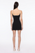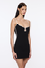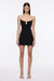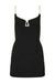The Marlo Mini Dress features a sleek black and white design with a structured dipped neckline and white contrast binding. Made in New Zealand from slightly stretchy fabric, it offers a refined and elegant silhouette.