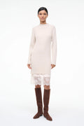 The Willow Sweater Dress combines effortless elegance with thoughtful design. Crafted from a luxurious wool blend, this piece features a refined mock neck and long sleeves for timeless sophistication. The standout layered contrast lace hem adds visual interest and dimension, eliminating the need for additional styling. Perfect for transitional seasons, this dress delivers polished versatility whether worn solo or layered with your favorite accessories.