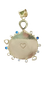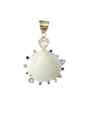 A sophisticated pendant showcasing a white shell center surrounded by aquamarine, sapphires, and diamond accents. Handcrafted with gold backing and custom bail. 1.5" x 2".
