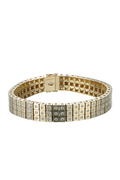 Three rows of brilliant round diamonds flow across substantial gold square links in this striking tennis bracelet. Featuring .94 carats of total diamond weight set in 14K gold, it combines timeless elegance with contemporary geometric design. A sophisticated statement piece that balances classic refinement with modern boldness.