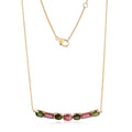 Reimagining traditional Indian floral patterns with contemporary elegance, this Petal Bar Necklace features striking pink and green tourmaline gemstones set in luxurious 14K gold. The refined geometric interpretation offers a sophisticated statement piece that transitions effortlessly from day to evening wear, celebrating both cultural heritage and modern design sensibility.