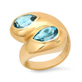 Indulge in elegance with the Topaz Moi et Toi ring. Two deep blue London Topaz Pear shapes intertwine in a rich gold setting, a symbol of two unique individuals forming a formidable union. This ring embodies our authentic selves, celebrating our strengths and flaws as something truly special.