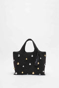 Elevate your everyday carry with this charming mini market tote, crafted from soft washed black denim and adorned with subtle stud accents. The included logo bag charm features a polished silver-tone metal plaque—a witty nod to Highland Park's vibrant character. Perfect for lunch outings, quick errands, or as a stylish accessory that bridges playful design with understated elegance.