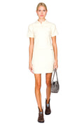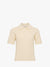 The Cropped Cable Knit Polo in cream features a refined cropped fit with elegant cable knit detailing and a relaxed dropped shoulder. Finished with tonal buttons and a subtle silver branded applique, this sophisticated top offers a timeless blend of comfort and style.