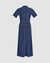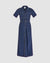 The Janitoress Maxi Dress in dark blue ridged moiré offers a sleek silhouette with contrast stitching and a front slit, combining elegance and comfort for any refined occasion.