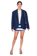 This navy pinstripe blazer jacket offers a timeless, tailored fit that pairs effortlessly with a mini skirt or a white tee and jeans. Its versatile design adds a polished touch to any outfit, making it a sophisticated staple for your wardrobe.