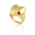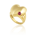 This 18K gold ring features a charming puffy heart design accented by a smooth, off-centered cabochon ruby. Its refined simplicity makes it a timeless piece, perfect for adding a subtle touch of sophistication to any outfit.
