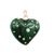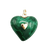 This elegant pendant features a hand-carved green malachite heart accented with gold balls and three VS+ manmade diamonds totaling 0.14 carats. The piece includes a handmade triangle bail and a gold heart on the back, measuring 1.25" x 1" x 0.25". Its refined design combines natural beauty with subtle sparkle, perfect for adding a sophisticated touch to any outfit.