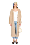 The Cimonello Cardigan offers elegant comfort with its warm wool and mohair blend. Its neutral color and classic V-neck with button closure make it a versatile layering piece or a cozy maxi dress, ideal for sophisticated style all year.