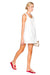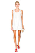 The Nessie Dress is made from soft organic cotton poplin with a breezy fit. It features a scoop neckline, mother-of-pearl buttons, and a grosgrain ribbon tie. Eyelet embroidery and ladder trim add elegant details to the neckline, sleeves, yoke, and hem.