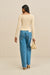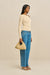 Woman wearing a cream long sleeve shirt with a ring detail at the shoulder, paired with blue jeans.