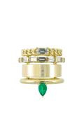 A luxurious four-piece stack ring in 14K gold featuring a pear-shaped emerald centerpiece, emerald cut white sapphires, pavé diamonds, and a bold cigar band. This sophisticated combination creates an elegant, statement-making design that showcases refined taste and timeless beauty.