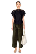 The Luna Top combines soft black viscose with delicate tonal eyelash lace trim for an elegant finish. Its gently draped silhouette is enhanced by a high scalloped neckline and flutter sleeves, creating a refined and feminine look perfect for any occasion.