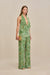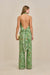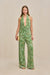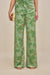 Woman wearing a green wide leg pant with velvet and silk burnout patterns and gold details, paired with a matching top.