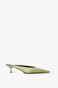 The Sloan Kitten Mule features an elongating pinched, closed-toe design crafted from luxurious satin in Pale Green. Its 45mm tonal lacquered heel adds subtle texture, while a woven brand label on the insole enhances its refined look. With a padded insock and leather lining, this elegant mule offers both comfort and sophistication.