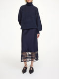 The Blake Skirt brings understated elegance to your wardrobe with its fluid navy silhouette and delicate lace trim. This midi length piece drapes beautifully, offering a refined option for both professional settings and evening occasions. The intricate lace detailing adds a touch of femininity without compromising its polished aesthetic. Perfect for layering or wearing solo, this skirt transitions effortlessly from day to night.