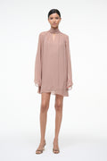 The Esther Mini Dress offers an elegant silhouette with its long sleeves and flowing mini length. Crafted with a delicate sheer chiffon overlay, it features a refined keyhole cutout and a sophisticated scarf neck tie, adding subtle allure and versatility. Perfect for occasions where grace and understated charm are essential.