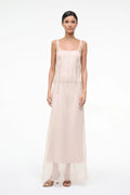 The Greta Silk Dress epitomizes understated elegance with its luxurious sheer silk construction and refined details. Mother of pearl buttons add a luminous touch, while the graceful low back creates an alluring silhouette. A discreet zipper closure ensures a seamless fit, and the gently flared hem provides movement and sophistication. Perfect for evening occasions or elevated everyday wear.