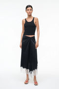 The Sonoma Silk Skirt showcases a gathered center waist detail paired with a delicate lace edge and asymmetrical hem in classic black. Crafted from silk-spandex blend fabric, it balances structured tailoring with fluid movement for an elegant silhouette. Equally at home for daytime sophistication or evening occasions, this versatile piece elevates any wardrobe.