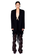 This black wool gabardine jacket, offers a collarless design for a modern, refined look. Featuring front and breast pockets and a secure clasp front closure, it combines elegance with practical details, perfect for elevating any outfit.
