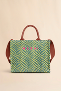 Handbag with a green and yellow striped pattern and pink text on a beige background