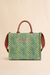 Elevate your everyday carry with this artfully crafted woven basket bag. Vibrant, interlocking patterns create visual intrigue, while a striking contrasting logo adds a designer touch. Rich brown leather accents frame the top handle and adjustable cross-body strap, delivering both refinement and versatility. This compact silhouette balances bohemian charm with polished sophistication.