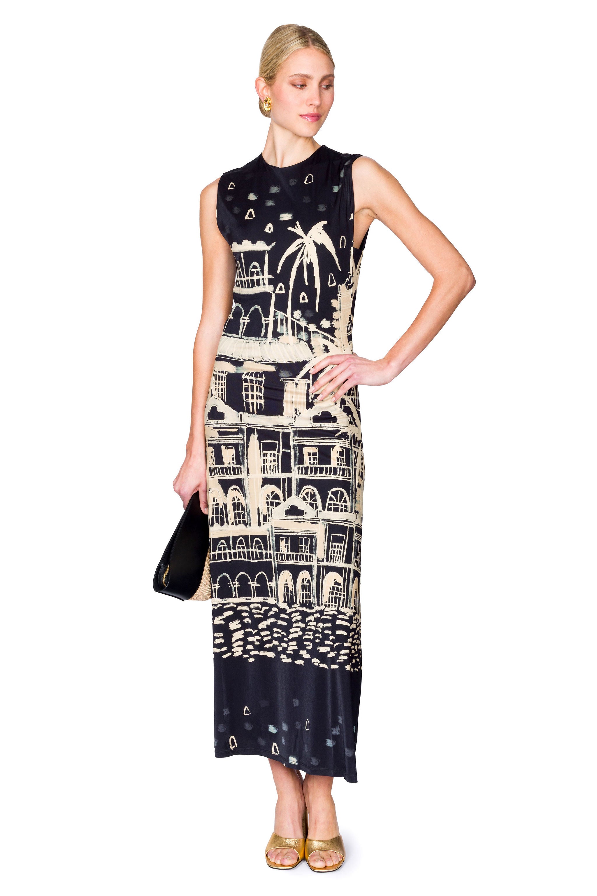 Elevate your wardrobe with this sophisticated ankle-length dress, crafted from lustrous shiny jersey that catches the light beautifully. The sleeveless silhouette and refined straight neckline create an elongated, streamlined silhouette that exudes understated elegance. Featuring an exclusive JO landscape print, this piece seamlessly transitions from day to evening occasions. The clean lines and premium fabric ensure a polished appearance that works as a versatile foundation for your personal style.