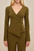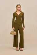 Woman wearing a green ribbed long sleeve top that features a V-neck and a wrap detail secured with gold-toned hardware, paired with matching wide leg pants.
