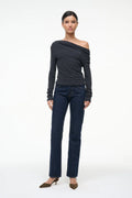 The Philomena Top effortlessly combines elegance with contemporary style. Crafted from soft jersey fabric, this piece features fitted sleeves that provide subtle structure while an asymmetrical draped neckline creates an off-the-shoulder silhouette. The result is a refined, versatile top that transitions seamlessly from day to evening, offering a touch of understated sophistication to any wardrobe.