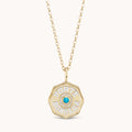 The Marlo Laz amulet, the Porte Bonheur, French for I bring good luck and lucky charm, represents Luck, Happiness, and All Good Things. Our free flowing shaped coin features our bespoke Marlo Laz font, with handpainted enamel and features a stunning Turquoise. Turquoise is the stone of shamans, chiefs, and warriors. A protective stone, it promises wisdom, tranquility, and hope. Turquoise is connected to the Sagittarius and Capricorn zodiac signs.