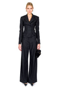 The Nova Blazer redefines tailored elegance with its refined grey double-breasted silhouette, elevated by a striking oversized white bow detail positioned at the back. This accent creates dimensional shape, transforming a classic blazer into a statement piece. Perfect for those who appreciate understated luxury with an unexpected twist, it seamlessly transitions from boardroom to evening occasions.