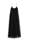 This bohemian maxi dress features delicate floral embroidery on plissé tulle, embodying a light, transparent look layered over a soft crepe de Chine lining. Inspired by the TOTEME Summer 25 runway, it offers an elegant yet effortless style. Pair it with heeled mules to complete the sophisticated ensemble.