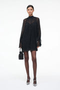 The Roux Dress is your go-to for effortless elegance. This embellished crinkle chiffon mini features a refined high neck with a charming bow-tie back detail. Poet sleeves and neckline shirring add graceful movement and dimension, while the removable under slip offers styling flexibility for any occasion. Perfect for parties and special events.