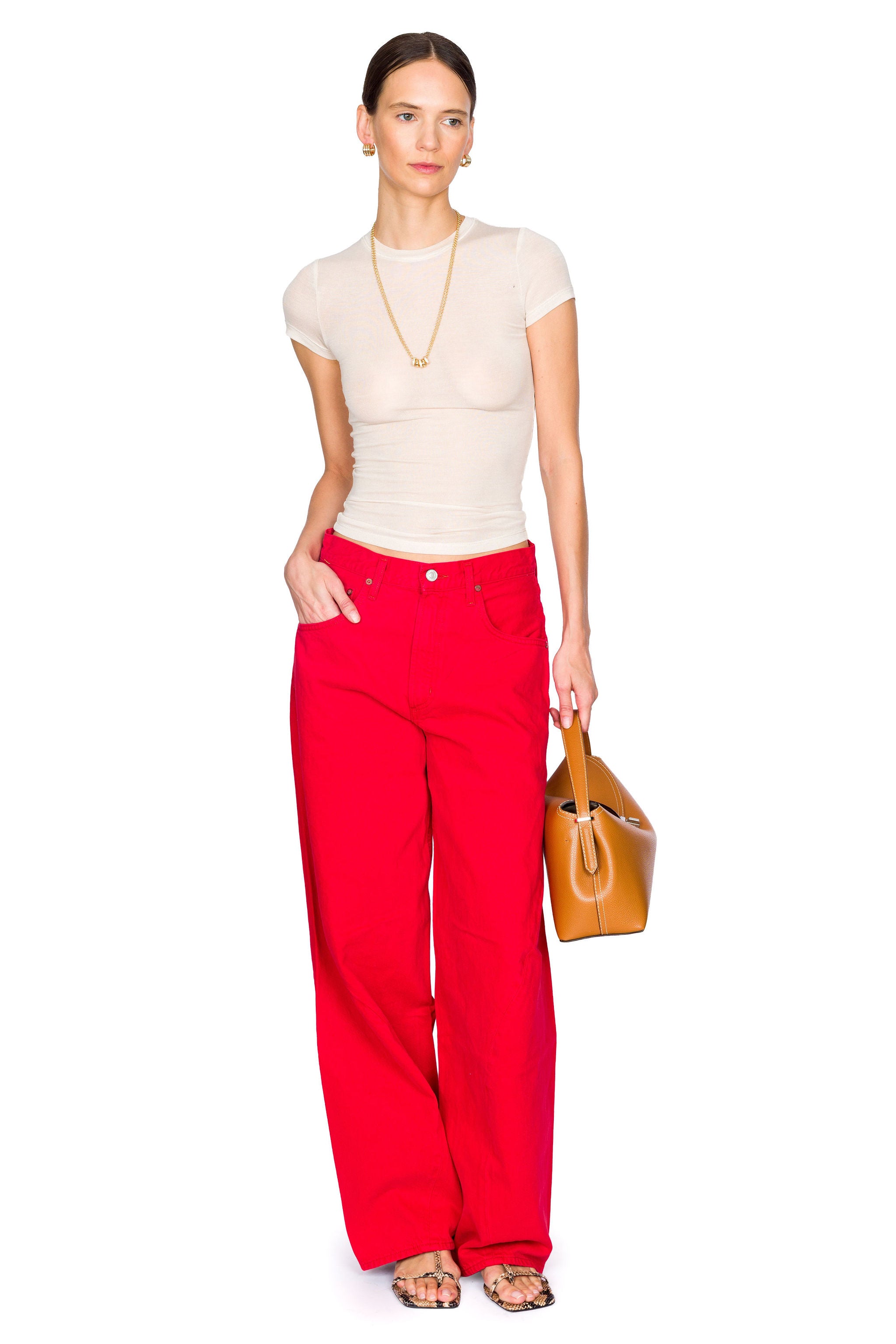 The Twist Jean redefines casual elegance with its relaxed leg and distinctive twisted outseam, offering a fresh take on the classic baggy silhouette. Crafted from vibrant red wash denim, this jean adds a bold yet refined statement to your wardrobe, blending comfort with sophisticated style.