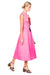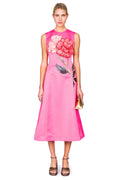 Elegant painterly peonies in cream and vibrant red bloom across a striking fuchsia canvas on this premium sleeveless midi dress. Featuring exclusive LEO LIN placement embroidery, a round neckline, and fitted waist that flows into an A-line silhouette, this piece makes an unapologetically romantic statement. The invisible back zip closure and full lining ensure a polished finish. Perfect for those who embrace dramatic elegance.