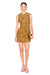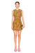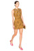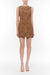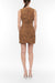 This sleeveless brown A-line mini dress offers a refined silhouette, enhanced by subtle pink floral embellishments around the collar and bust. Its elegant design balances simplicity with delicate detailing, making it an ideal choice for sophisticated, stylish occasions.