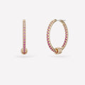 The Argo Demi Pink Ombre hoops elevate a timeless silhouette with pink sapphire pavé stones that graduate in hue, creating a delicate ombré effect. Crafted in luxurious 18K gold, they feature three mixed metal annulets in yellow and rose gold for subtle movement and texture. Lightweight and meticulously handmade in Los Angeles, these earrings blend refined elegance with artisanal detail.