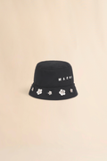 Italian-crafted bucket hat in crinkled nylon taffeta with water-repellent protection. Features a padded interior for comfort and an elegant brim adorned with satin daisy appliqués, baguette gemstones, and a silver pearl. Embroidered Marni logo. A refined accessory for discerning style.