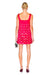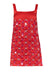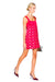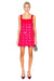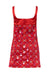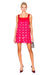 This sleeveless A-line mini dress features a striking red satin fitted bodice that elegantly highlights the empire waist. Below, a delicate pink and white lattice embellishment adds a refined touch, creating a sophisticated contrast that enhances the dress’s graceful silhouette. Perfect for occasions where understated elegance meets modern style.