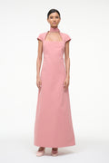 The Ingrid Dress offers an elegant maxi silhouette with a relaxed fit that drapes gracefully throughout the body. Its distinctive cutout square neckline and asymmetrical neck sash add a refined, contemporary touch, complemented by delicate cap sleeves. Perfect for making a subtle yet sophisticated statement, this dress combines comfort with unique design details for effortless style.