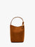Crafted from pinstriped brown suede, the JWA Corner Small Bucket Bag features a distinctive oversized gold link on the shoulder strap, adding a touch of luxury to its sleek silhouette. This sophisticated design blends texture and metallic accents for an elegant statement piece perfect for refined occasions.