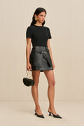 Woman wearing a black leather open wrap-skirt, worn over a black mini skirt with a black t-shirt and heels.