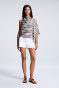 The Lota Top features an asymmetric one-shoulder drape crafted from a soft, earthy striped linen blend. This top offers comfort and subtle stretch. Pair it with wide-leg trousers or high-rise shorts for a versatile, modern look that transitions effortlessly from day to night.