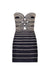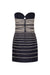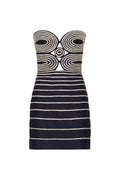 Strapless mini dress in navy with sweetheart neckline and white embroidery.